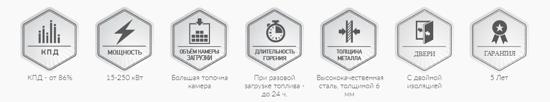 • Большие загрузочные двери, установленные под наклоном, которые позволяют использовать различные виды топлива: как сыпучего типа, так и твердое топливо, большое по размерам;