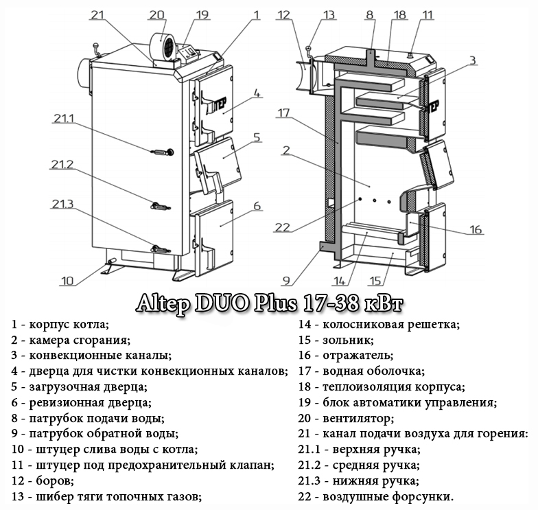 Котлы серии DUO Plus оснащены вентилятором и блоком управления для автоматизации работы котла. Блок управления управляет работой вентилятора и насоса системы отопления. Котлы адаптированы под установку механического регулятора тяги.