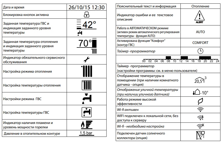 Чтобы выключить котел, нажмите кнопку ON/OFF (ВКЛ/ВЫКЛ); на дисплее останется отображение индикаторов таймерапрограмматора и времени. Функция защиты от замерзания при этом также выключается.