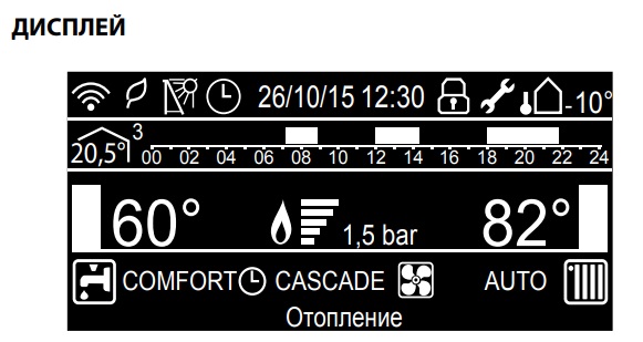 Эта функция поддерживает вторичный теплообменник ГВС (или бойлер косвенного нагрева) в подогретом состоянии даже во время отсутствия запроса на приготовление горячей воды. Функция активируется при нажатии кнопки COMFORT (5). Пока функция активна, на дисплее отображается надпись COMFORT.