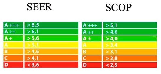 Что такое класс энергопотребления? Класс энергопотребления зависит от потребления блоком энергии. Класс энергопотребления кондиционера делится на семь категорий (от A до G). Более экономные кондиционеры относятся ближе к категории А, менее экономные к категории G. Класс энергопотребления также обозначается цветовой маркировкой, соответствующей классу. Пользователь, в ниже приведенной таблице, с легкостью сможет определить класс энергопотребления, соответствующий кондиционеру. Есть две категории определения энергопотребления кондиционера. Коэффициент EER выражает класс энергопотребления кондиционера при охлаждении, а коэффициент СОР выражает класс энергопотребления кондиционера при нагреве.