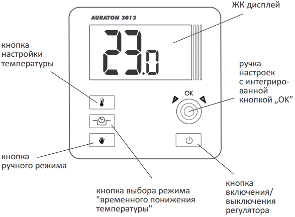 Описание AURATON 3013 комнатный терморегулятор Предназначен для работы с любым отопительным оборудованием. За счет высокой нагрузочной способности исполнительного реле (16А), может с успехом применяться для управления электрическими конвекторами и другим электрооборудованием мощностью до 3,5 кВт.