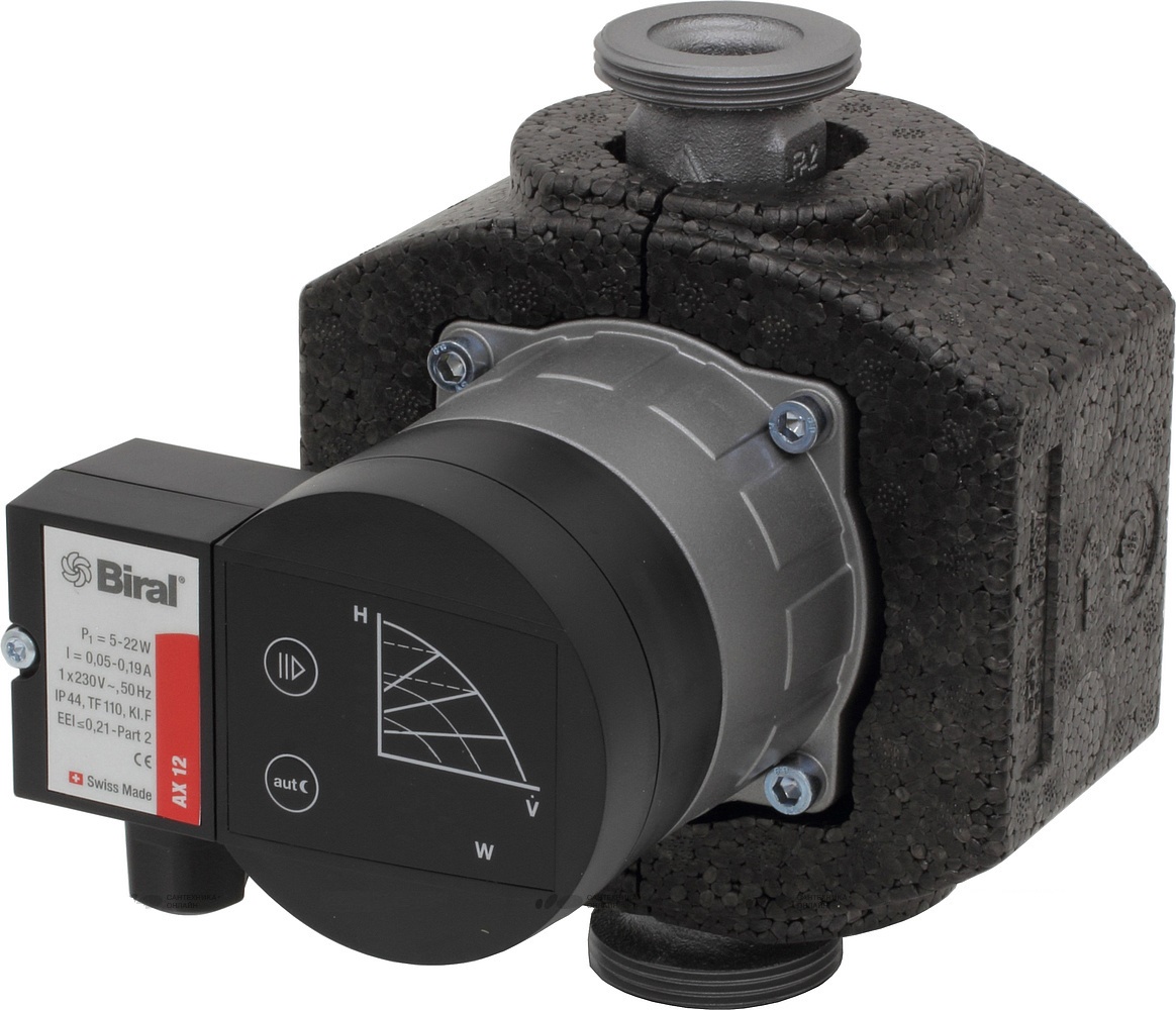 Циркуляционный насос Biral AX 12-3 высокоэффективный насос класса А, используемый для циркуляции воды в отопительной системе домов. Насос имеет: Электронный дисплей, с указанием текущего потребления энергии и параметров функционирования (давление/поток); Возможность установки двух режимов функционирования «ночь-день» при постоянном или переменном давление. Установка включения /отключение (обратный клапан и шаровой клапан). Корпус насоса из бронзы.
