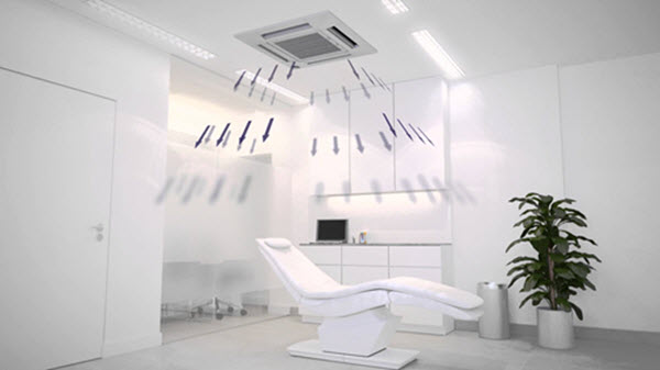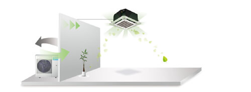 • Кассеты могут быть установлены в местах с ограниченным пространством на потолке, поскольку устройство не требует воздуховодов, если только не поступает свежий воздух. Идеально подходит для подвесных потолков.