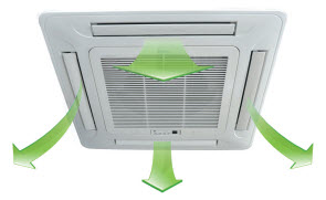 • Кассеты распределяют воздух в четырех направлениях, поэтому, как правило, располагаются по центру в зоне кондиционирования. Для угловых установок один или два клапана могут быть отключены.