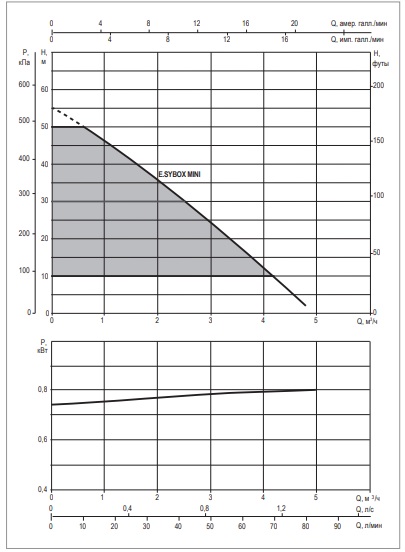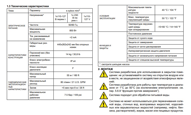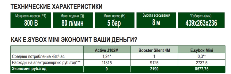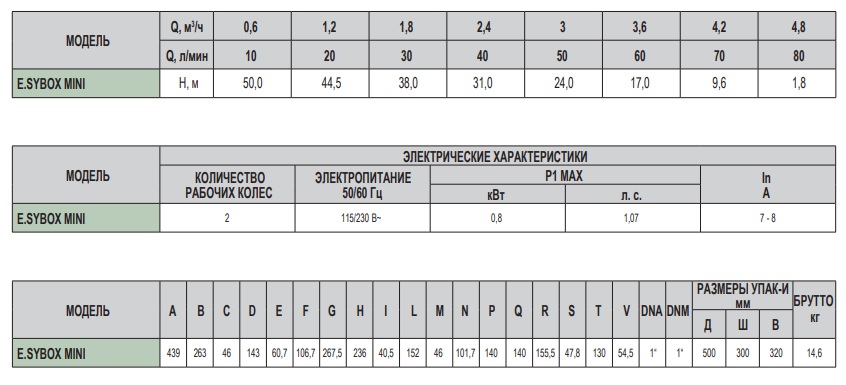 E.SYBOX MINI состоит из высокоскоростного самовсасывающего насоса с двумя рабочими колесами, встроенного частотного преобразователя, датчиков давления и протока, ЖК-экрана высокого разрешения для настройки и отображения информации о работе станции, встроенного мембранного бака объемом 1 литр и обратного клапана. Благодаря напорным и всасывающим патрубкам, расположенным спереди и снизу, а также компактным размерам, возможна установка, как в горизонтальном, так и в вертикальном положении, в том числе в местах с плохой вентиляцией. Комплект креплений E.SYWALL позволяет выполнить монтаж на стену, экономя еще больше пространства в вашем доме. E.SYBOX MINI способен всасывать (поднимать) воду с 8 метров, при этом заполняя всю систему менее чем за 5 минут. Новый энергоэффективный электродвигатель с водяным охлаждением (до 6000 об/мин), антивибрационные опоры, встроенная электроника обеспечивают компактность и удобство пользования насосной станцией. Все компоненты выполнены исключительно из надежных и высококачественных материалов. Благодаря встроенным защитам и системе антифриз (защита от замерзания), E.SYBOX MINI способен самостоятельно защитить себя от всех возможных проблем. С помощью ЖК-экрана высокого разр