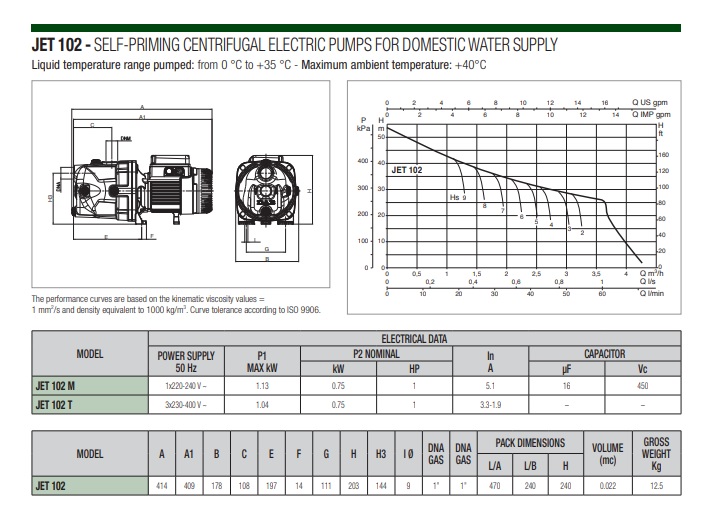 Поверхностный самовсасывающий центробежный насос DAB JET 102 M-P имеет значительную всасывающую способность даже в том случае, когда вода наполнена пузырьками или небольшим количеством взвешенного песка.