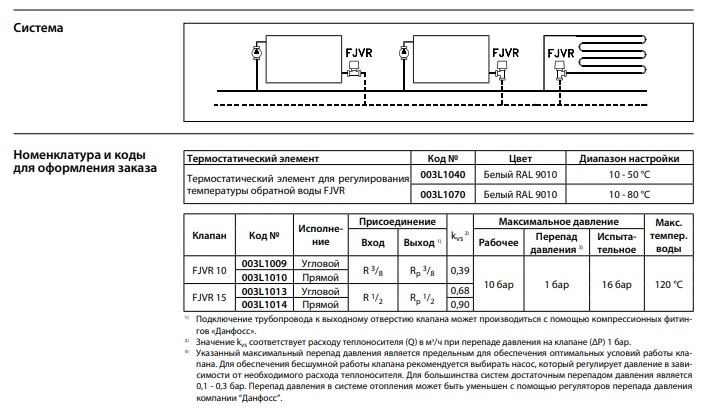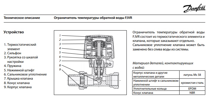 Danfoss RTL FJVR-FJVR15 Угловое - Ограничитель температуры обратной воды FJVR автоматически поддерживает на заданном уровне температуру теплоносителя после радиатора, конвектора или циркуляционного контура системы напольного отопления. В системах вентиляции FJVR обеспечивает минимальную необходимую циркуляцию воды через калорифер. FJVR - автоматический клапан с пропорциональным регулированием ( P-function). Корпус клапана FJVR изготавливают из латуни и покрывают наружную поверхность никелем.
