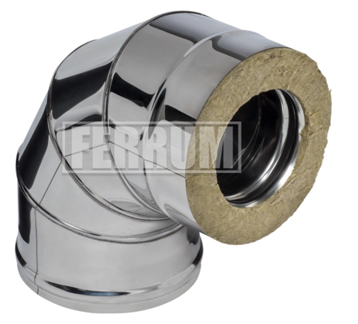 Утепленный дымоходный Угол FERRUM Ø 115-200 90° (430/0,5 mm) Двустенный дымоход или сэндвич представляет собой конструкцию, состоящую из двух труб разного диаметра (внешней и внутренней). Пространство между этими трубами заполнено теплоизоляционным материалом негорючего свойства. Наполнитель состоит из базальтового волокна высокого качества. Такая конструкция способствует быстрому нагреву внутренней трубы. За короткий промежуток времени после старта температура в дымоходе поднимается выше «точки росы», и это помогает избежать образование конденсата.