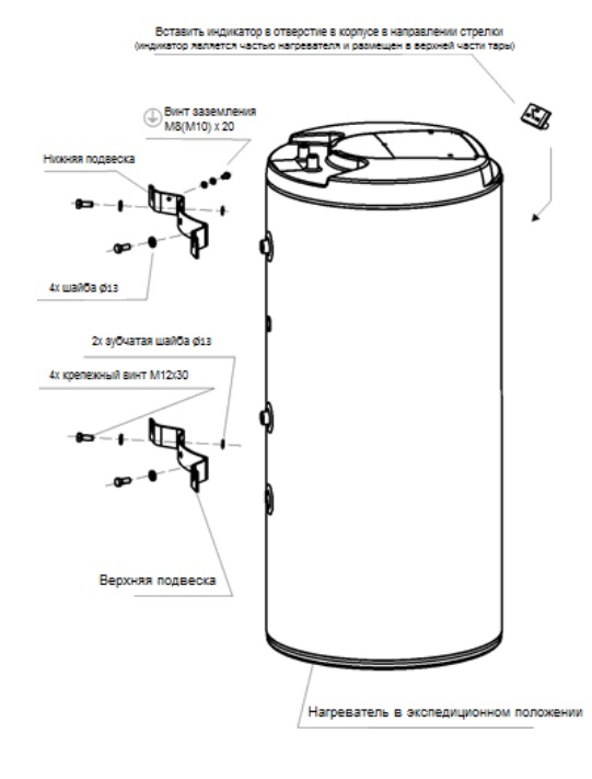 Баки изготовлены из стального листа и проверено в 1,5 раза большим значением рабочего давления, без внутреннего покрытия поверхности. Внутренняя поверхность резервуара эмалирована. К нижнему дну резервуара приварен фланец, к которому привинчена крышка фланца. Между крышкой фланца и фланцем вложено уплотнительное кольцо. В крышке фланца имеются гильзы для размещения датчиков регулирующего термостата и термометра. На гайке М8 установлен анодный стержень. Резервуар с водой изолирован твердой полиуретановой пеной. Электропроводка располагается под пластиковой съемной крышкой. Температуру воды можно установить термостатом. К напорной емкости приварен теплообменник (теплообменники).