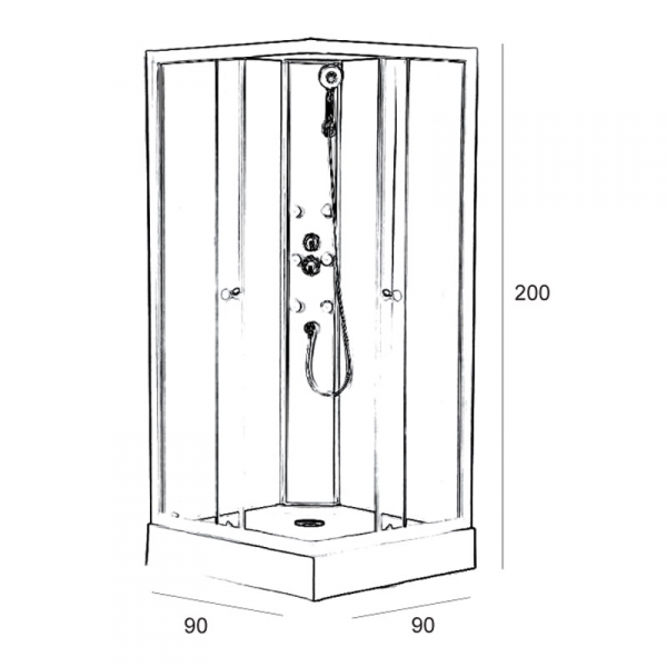 • ABS + Акриловый душевой поддон, размеры 90x90x15см, включает сифон;
