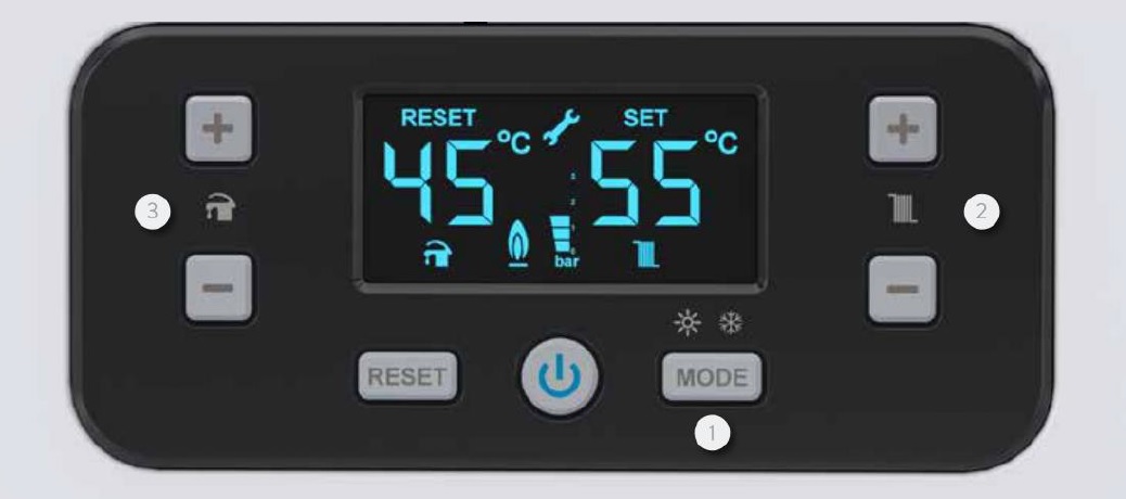 3. Кнопка регулирования температуры ГВС  для бытового потребления: от 35°C – до 64°C.