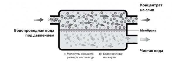 Обратный осмос является наиболее совершенной технологией очистки воды. Благодаря специальной полупроницаемой мембране появилась возможность эффективно очищать питьевую воду фактически от всех вредных примесей, включая бактерии и вирусы. Поры такой мембраны в 200 раз меньше, чем вирусы, и в 4000 раз меньше, чем бактерии.