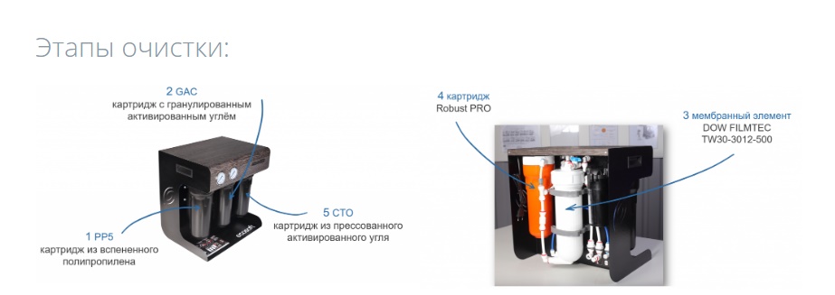 • Мембранная очистка (обратноосмотический элемент Dow Filmtec™) — обеспечивает удаление 99.8% растворённых примесей, а также вирусов и бактерий