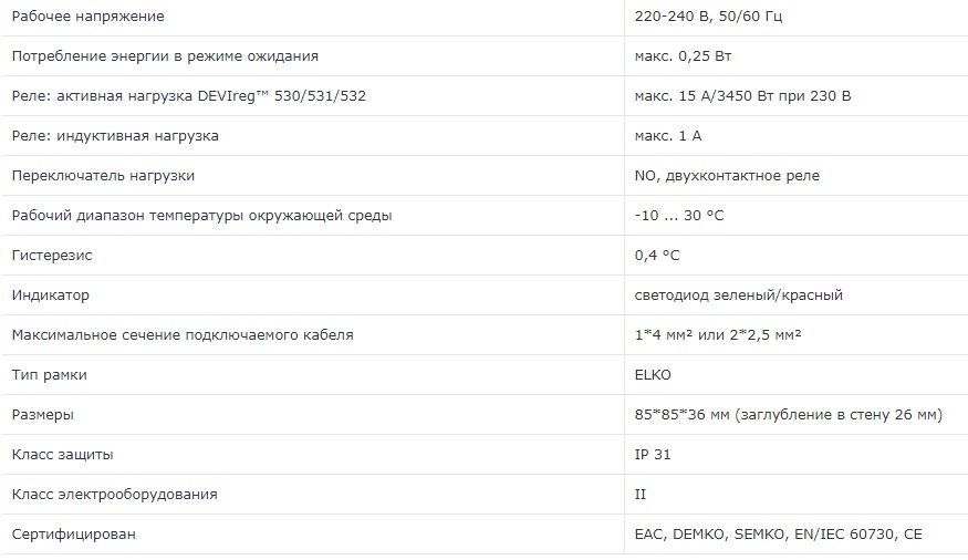 Электронные терморегуляторы применяются для систем комфортного подогрева поверхности или для систем полного отопления помещений. Конструкция корпуса предполагает установку на стену в монтажную коробку. Двухполярный выключатель питания. DEVlreg™ 530 для систем комфортного подогрева пола с датчиком температуры пола на проводе; активная нагрузка 16А;