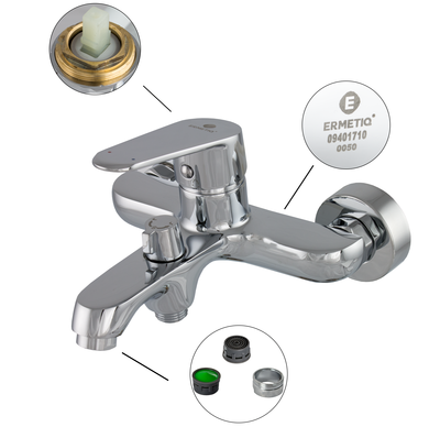 Смеситель однорычажный для ванной с лейкой и коротким гусаком цвета хрома Ermetiq ER-A201 на два отверстия. Корпус изготовлен из высококачественной латуни, что значительно увеличивает срок эксплуатации смесителя.