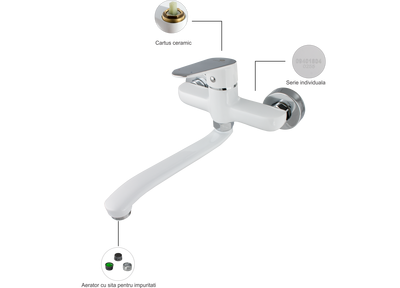 Тип смесителя на два отверстия позволяет осуществить раздельную подводку и горячей, и холодной воды, что оптимально даже для установки непрофессиональными мастерами. Данную модель можно установить на стену. Тип установки смесителя на стену оптимален для распространенных коммуникационных систем, позволяя осуществлять подводку горячей и холодной воды, не требуя особых навыков. Изготовлен из латуни и имеет цвет белый. Латунный корпус смесителей считается наиболее практичным вариантом для оформления ванной комнаты ввиду отменных показателей долговечности и устойчивости к повреждениям. Белый цвет смесителей станет органичным дополнением целостности интерьеров в ванной, подчеркивая непринужденность и чистоту, и удачно гармонируя с алебастром сантехники. Страна производитель данной модели - Румыния.