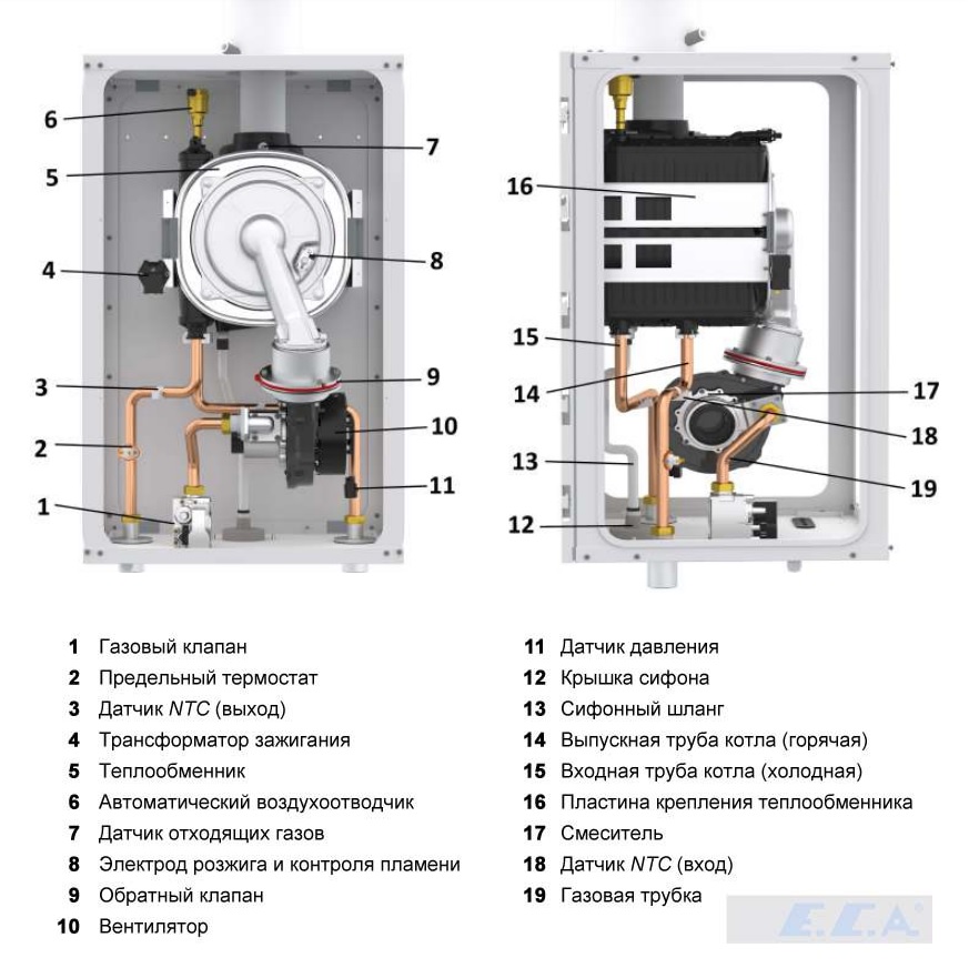 – предохранительное устройство от низкого давления воды (0,8 бар) блокирует работу котла при низком давлении теплоносителя;
