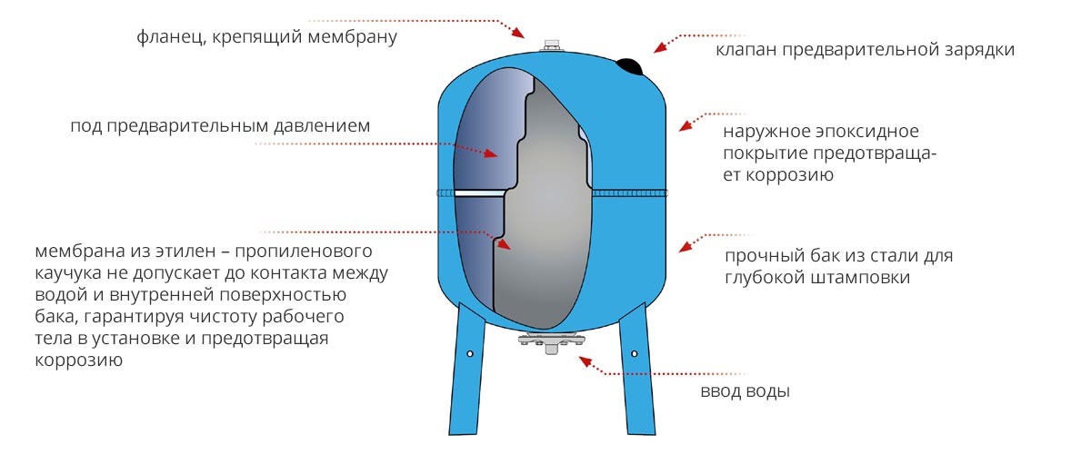 1.   Мембрана отделяет воду от стенок бака, предотвращает коррозию и загрязнение установки, а также стабилизирует давление. При первом подключении бака к установке происходит пуск гидрофорного насоса, давление растёт, а вода заполняет мембрану.
