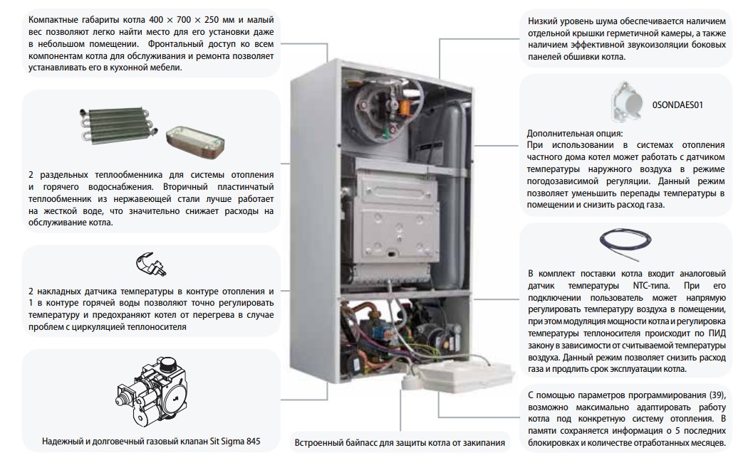 Котел имеет герметичную камеру сгорания из стального проката и керамических панелей, что обеспечивает безопасную и эффективную работу. Он также оснащен специальным вытяжным устройством, позволяющим использовать подвижную коаксиальную дымоотводную трубу длиной примерно 1 метр. Эта функция особенно полезна там, где нет отдельной классической выхлопной трубы или если существующая выхлопная труба имеет проблемы с тягой.