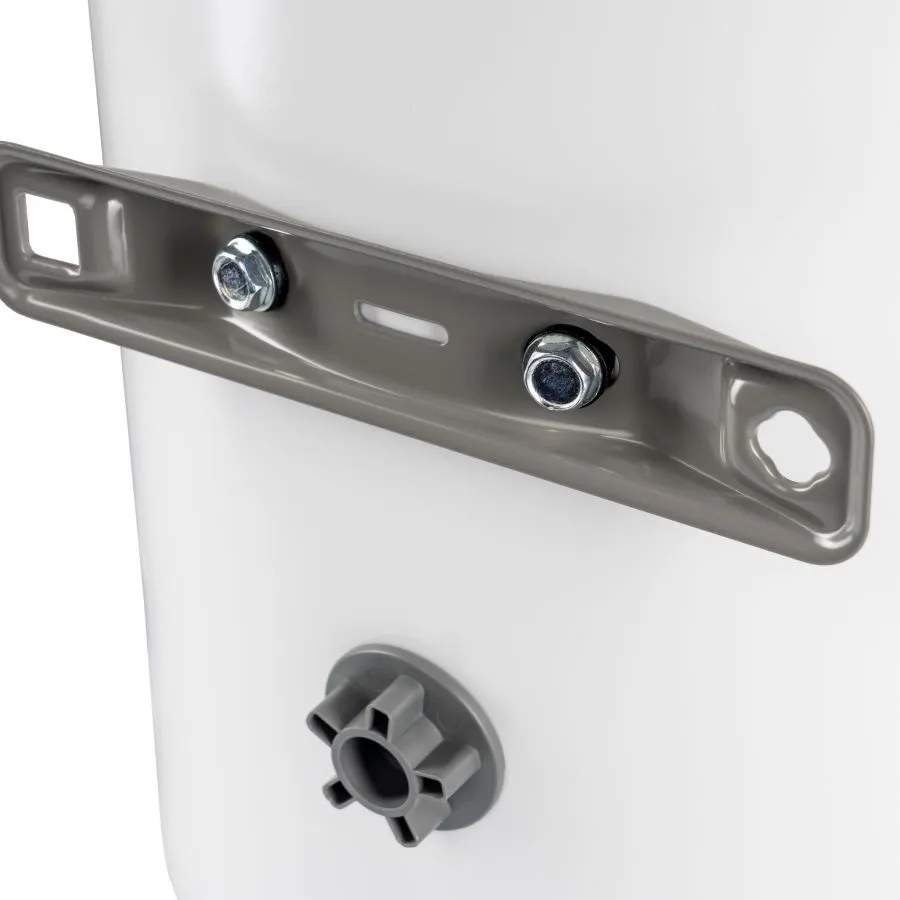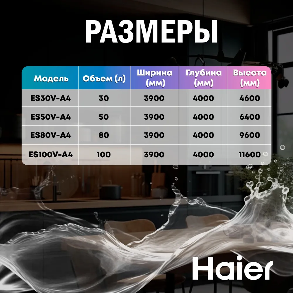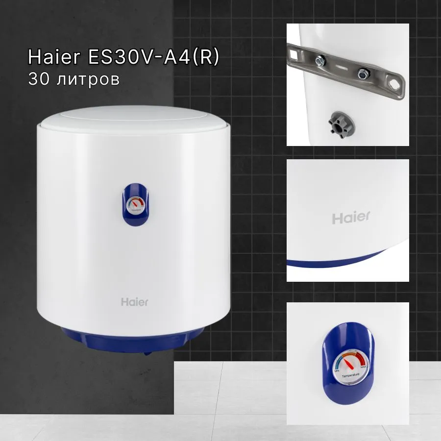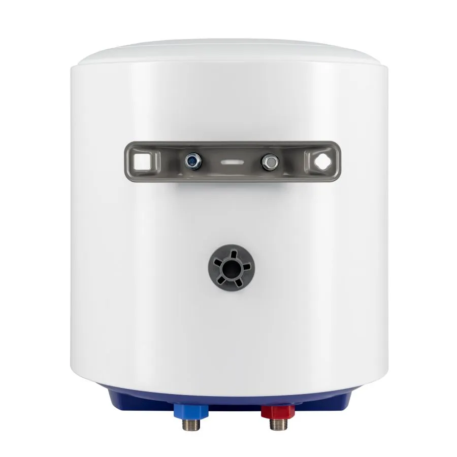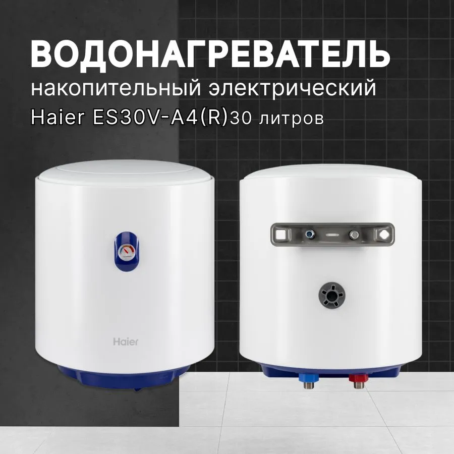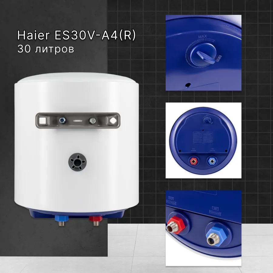 Вертикального исполнения. Цилиндрической формы. Для настенного монтажа. Внутренний бак из стали с эмалевым покрытием. Корпус металлический, цвет белый. Термометр на лицевой стороне. Механический регулятор температуры на нижней крышке. Патрубки холодной и горячей воды расположены снизу. Расстояние между патрубками 100 мм. Диаметр подключения 1/2" наружняя резьба. Фирменная технология Haier для защиты от поражения электрическим током - ShockProof - диэлектрические проставки на патрубках.
