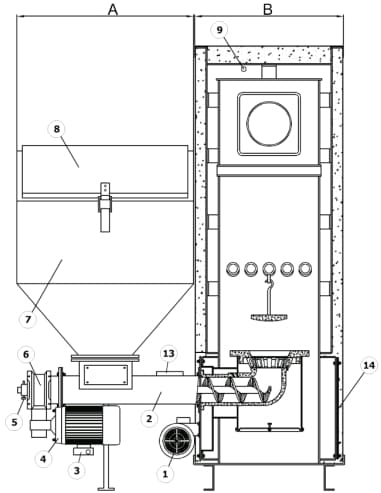1-вентилятор, 2-шнек, 3-конденсатор, 4-двигатель шнека, 5-шпонка, 6-редуктор, 7-бункер топлива, 8-крышка бункера, 9-гильза датчика температуры, 10-водяная колонна, 11-водяные профильные трубы, 12-чистка горелки, 13-гильза датчика шнека, 14-заглушка горелки, 15-горелка, 16-патрубок слива, 17-патрубок возврата, 18-изоляция, 19-шпилька, 20-дымоход, 21-патрубок подачи, 22-водяные колосники, 23-двери чистки теплообменника, 24-двери загрузки, 25-двери для чистки пепла.
