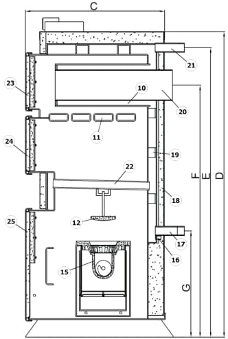 1-вентилятор, 2-шнек, 3-конденсатор, 4-двигатель шнека, 5-шпонка, 6-редуктор, 7-бункер топлива, 8-крышка бункера, 9-гильза датчика температуры, 10-водяная колонна, 11-водяные профильные трубы, 12-чистка горелки, 13-гильза датчика шнека, 14-заглушка горелки, 15-горелка, 16-патрубок слива, 17-патрубок возврата, 18-изоляция, 19-шпилька, 20-дымоход, 21-патрубок подачи, 22-водяные колосники, 23-двери чистки теплообменника, 24-двери загрузки, 25-двери для чистки пепла.