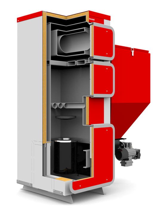 1-вентилятор, 2-шнек, 3-конденсатор, 4-двигатель шнека, 5-шпонка, 6-редуктор, 7-бункер топлива, 8-крышка бункера, 9-гильза датчика температуры, 10-водяная колонна, 11-водяные профильные трубы, 12-чистка горелки, 13-гильза датчика шнека, 14-заглушка горелки, 15-горелка, 16-патрубок слива, 17-патрубок возврата, 18-изоляция, 19-шпилька, 20-дымоход, 21-патрубок подачи, 22-водяные колосники, 23-двери чистки теплообменника, 24-двери загрузки, 25-двери для чистки пепла.