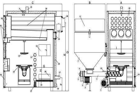 1-вентилятор, 2-шнек, 3-конденсатор, 4-двигатель шнека, 5-шпонка, 6-моторедуктор, 7-бункер топлива, 8-крышка бункера, 9-гильза датчика температуры, 10-теплообменник, 11-водная преграда, 12-дефлектор, 13-датчик температуры шнека, 14-заглушка шнека, 15-горелка, 16-патрубок слива, 17-патрубок возврата, 18-изоляция, 19-чистка, 20-дымоход, 21-патрубок подачи, 22-рушта, 23-двери для чистки, 24-двери загрузки, 25-двери для чистки пепла, 26-изоляция дверей, 27-шамотка, 28-вентилятор ручной топки
