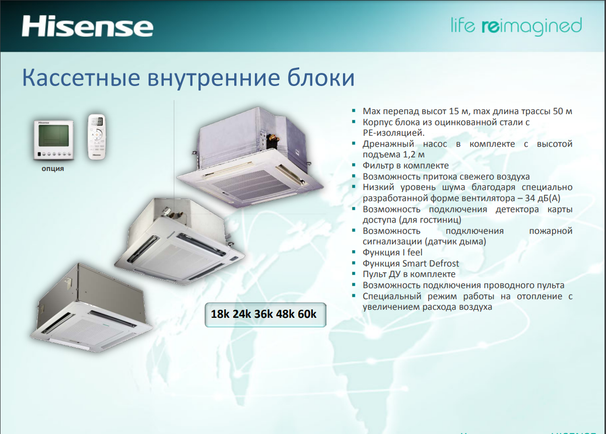 Внутренние блоки 4-ходового кассетного кондиционера Hisense серии ACT сочетают в себе технологии и комфорт в одном продукте, обеспечивающем энергетические характеристики до энергетического класса A++/A++ (A++/A+ в версии 5,0 кВт). Распространение воздуха с четырех сторон, которое также можно регулировать индивидуально, обеспечивает идеальный климат и непревзойденный комфорт. Эти кассетные внутренние блоки , оснащенные мощным и высокопроизводительным инверторным двигателем постоянного тока , содержат передовые технологии, гарантирующие эффективность, энергосбережение, тишину и комфорт. Ряд настраиваемых функций делает их использование простым и практичным, например, функции «Охлаждение», «Нагрев», «Осушение», «Вентиляция» или «Автоматическая функция», которые позволяют вам устанавливать комфортную температуру в зависимости от сезона и в соответствии с вашими потребностями; еженедельное программирование, таймер/сон, управление параметрами и многие другие режимы, которыми можно легко управлять с помощью пульта дистанционного управления и которые можно дополнительно изучить и изучить с помощью прилагаемого руководства пользователя. Кассетные внутренние блоки серии Hisense ACT имеют регулировку температуры , что позволяет в зимний период регулировать (увеличивать) поток воздуха во избежание расслоений и распределять воздух равномерно и равномерно, достигая любой точки помещения, подлежащей кондиционированию. с несравненным результатом во имя комфорта и благополучия пользователей. Кондиционер также имеет поплавок для контроля уровня воды и встроенный насос для отвода конденсата , которые, работая в синергии, позволяют управлять влажностью в помещениях, передавая ее во внутренний блок и правильно и постепенно выводя наружу (особенно во время функция осушения). Автоматический перезапуск предусматривает восстановление нормальной работоспособности внутреннего блока после внезапного прекращения подачи электрического тока.