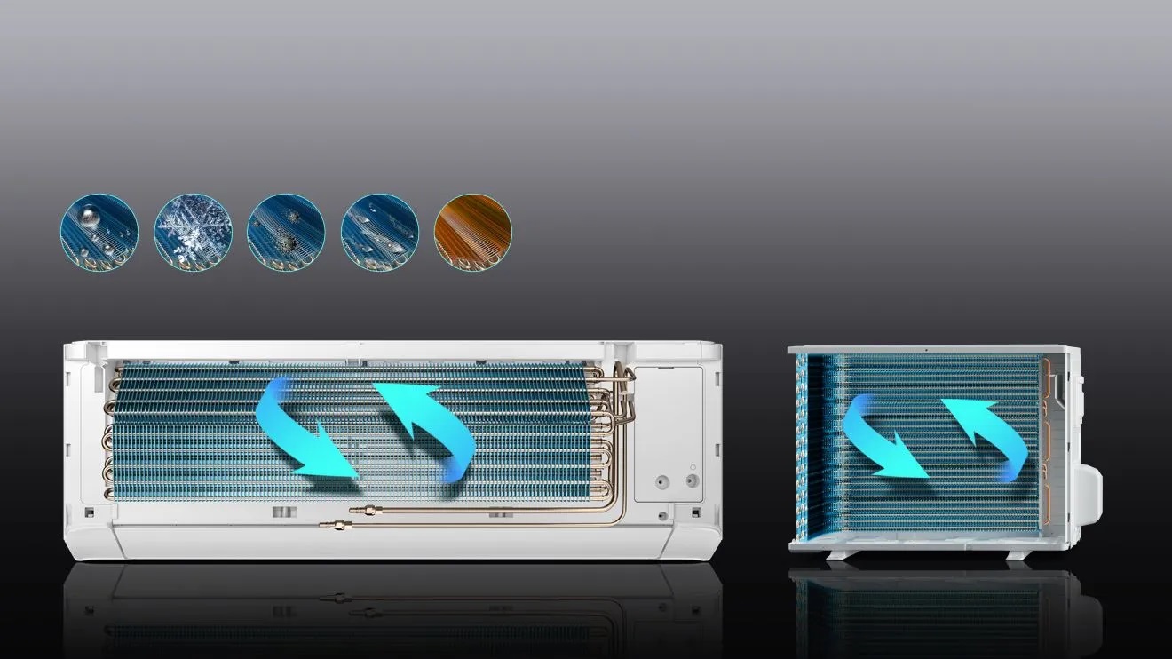 Устройство использует двойную систему самоочистки , которая удаляет пыль, бактерии и жир с внутренних и внешних блоков. Этот процесс влияет на эффективность и гигиену кондиционера без необходимости частого сервисного обслуживания.