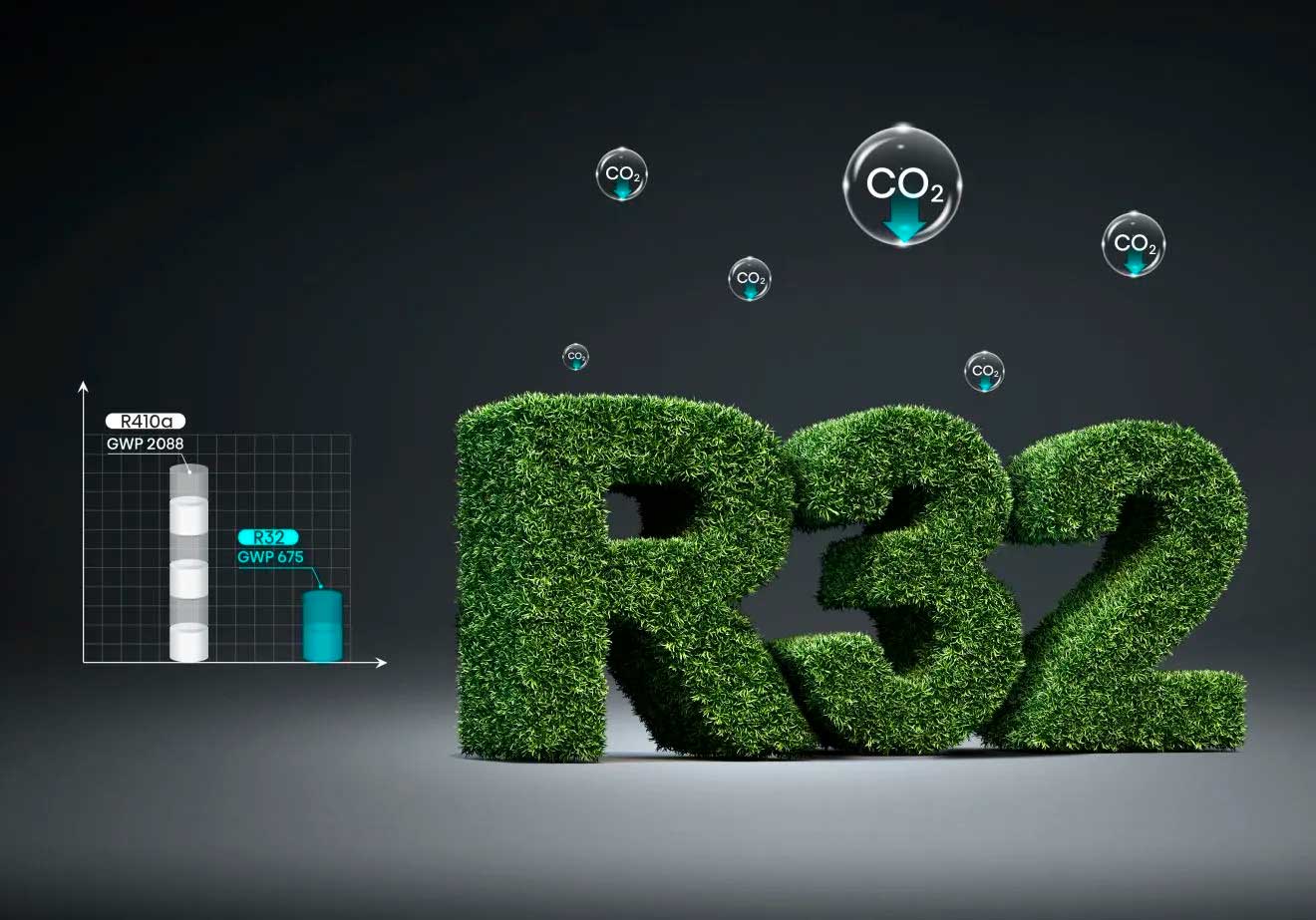 Хладагент R32 представляет собой более экологически чистую альтернативу с более высокой холодопроизводительностью при том же объеме. Это означает, что для работы каждого устройства требуется меньше хладагента, что ведет к снижению воздействия на глобальное потепление. Преимущества хладагента R32 включают нулевое воздействие на озоновый слой, на 66% более низкий коэффициент GWP (который измеряет влияние на глобальное потепление) по сравнению с газом R410A, более высокую энергоэффективность и более высокую теплоемкость/холодопроизводительность.