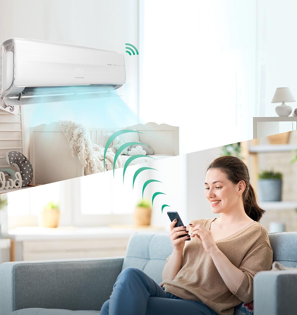 Управляйте работой кондиционера из любой части дома с помощью мобильного телефона и связи Wi-Fi. Это позволит подготовить комфортные условия к своему возвращению домой или удаленно позаботиться о домашних животных.