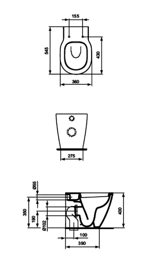 Подвесной унитаз IDEAL STANDARD CONNECT, 36,5x54 cm Это унитаз подвесного типа с горизонтальным отводом потока. Крышка в комплект не входит. Для прекрасной ванной необходим унитаз в соответствии с линиями раковины и любимым стилем ванной. Подвесной унитаз Connect Standard - идеальный выбор благодаря чистым линиям, прекрасным поверхностям, динамичным и внушительным размерам, призванным улучшить функциональный вид любой ванной комнаты.
