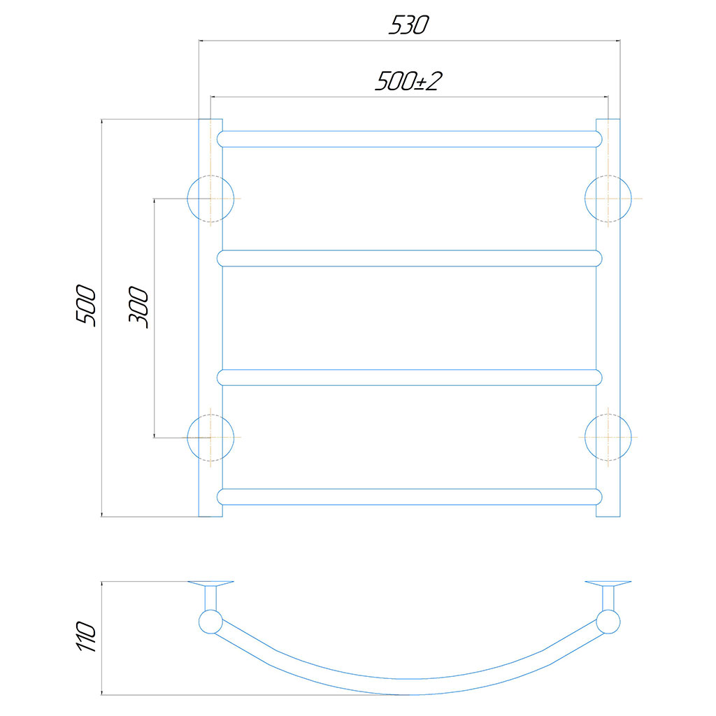 Полотенцесушитель «Классик» имеет четыре подвода с резьбовыми соединениями 1/2” для подключения к системе горячего водоснабжения, комплектуется четырьмя крепежными кронштейнами, заглушками 1/2” и краном Маевского.