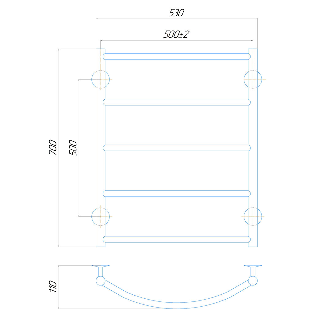 Полотенцесушитель «Классик» имеет четыре подвода с резьбовыми соединениями 1/2” для подключения к системе горячего водоснабжения, комплектуется четырьмя крепежными кронштейнами, заглушками 1/2” и краном Маевского.