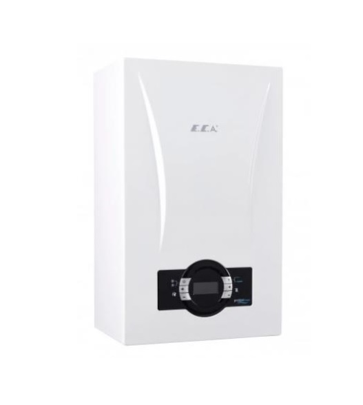 Газовый котел E.C.A. Gelios Plus 28 kW – данный котел имеет два теплообменника : первичный медный – вторичный из нержавеющей стали, КПД – 90,7%, максимальный расход приготовления горячей воды 12 л/минуту на (∆t =33,4 °C)