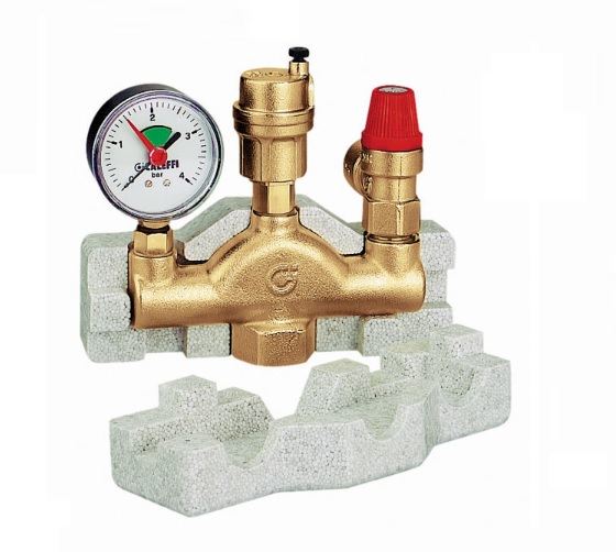 Группа безопасности CALEFFI 1" 3 bar ( Без изоляции) Предназначена для закрытых систем отопления. Консоль изготовлена из латунного литья MS 58. Благодаря особой конструкции, находящиеся в отапливаемой воде маленькие воздушные пузырьки отводятся к автоматическому деаэратору быстрого действия -CALEFFI. Нижний разъем с внутренней резьбой 1 дюйм предназначен для подключения котла.