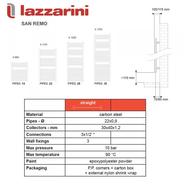 Дизайнерский полотенцесушитель Lazzarini 450x1110 мм и теплоотдачей 401 W, подходит тем, кто выбирает классический дизайн и функциональность. Расположение труб позволяет удобно сушить полотенца и одежду. Прибор вписывает как в классический, там и в современный интерьер ванной комнаты.