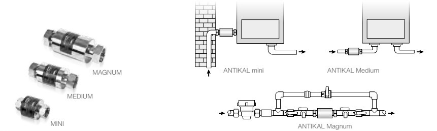 Вода в сетях водоснабжения всегда содержит некоторое количество солей кальция и магния, определяющих ее жесткость. При нагреве воды происходит химическая реакция, в результате которой образуется бикарбонат кальция (накипь) и углекислый газ. Поскольку бикарбонат кальция нерастворим в воде, он выпадает в осадок, образуя отложения на стенках трубопроводов и теплообменников, а углекислый газ приводит к коррозии. Для небольших систем бытового применения желательно найти такое решение, которое не требовало бы регулярного технического обслуживания и контроля со стороны квалифицированного персонала. Этим требованиям отвечают магнитные подавители накипи серии ANTIKAL, пригодные для обработки питьевой воды. Их установка предельно проста — в частности, благодаря специальной форме этих устройств, они могут быть установлены на котлы с монтажной рамкой DIMA. Устройства можно устанавливать как на входе в сеть водоснабжения, так и непосредственно перед защищаемыми устройствами - котлами, бойлерами, стиральными или посудомоечными машинами.Под воздействием высокоградиентного магнитного поля, которое создает активатор, накипь меняет свои физические свойства и преобразуется в более рыхлую. Вместо твердых отложений образуются взвешенные микрокристаллы, которые легко выносятся потоком воды из системы.