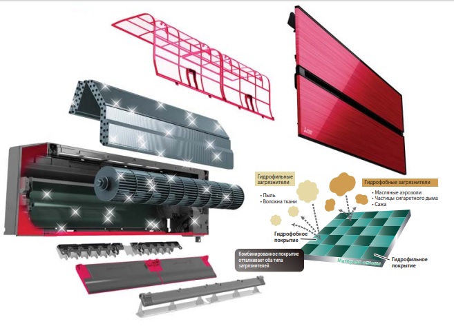 Очень важно, чтобы частицы-загрязнители не задерживались на внутренних поверхностях кондиционера. Для этого впервые была применена технология «Dual Barrier Coating». Поверхности крыльчатки вентилятора, алюминиевые ребра теплообменника, а также пластиковые детали, контактирующие с воздушным потоком, представляют собой «шахматную доску» из чередующихся гидрофобных и гидрофильных клеток миниатюрного размера. Гидрофобные участки, содержащие соединения фтора, отталкивают гидрофильные загрязнители: пыль, волокна ткани и т.п., а гидрофильные участки мешают прилипанию гидрофобных загрязнителей, таких как масляные аэрозоли, частицы сигаретного дыма, сажа и др.