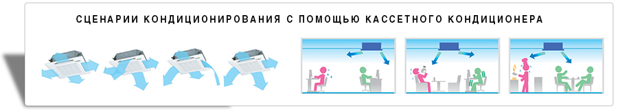 Главная особенность этого типа кондиционеров — распределение воздушных потоков во всех четырех направлениях. Кассетные кондиционеры Mitsubishi Heavy Ind. предоставляют возможность индивидуально управлять каждым из четырех потоков, тем самым создавая разные сценарии кондиционирования помещения.
