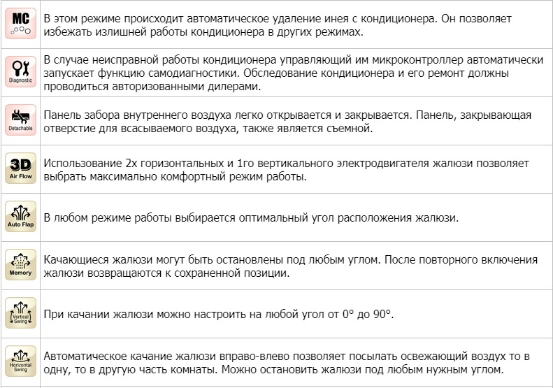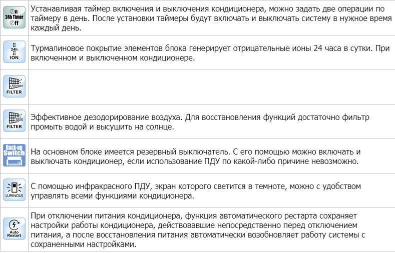Ионизируют воздух 24 часа в сутки Система ионизации наполняет воздух в обслуживаемом помещении отрицательными ионами. Данный процесс протекает даже тогда, когда кондиционер выключен. Во включенном состоянии этот эффект усиливается. Благодаря этому воздух в помещении будет всегда свежим, таким, как у горного ручья или в лесу после дождя.