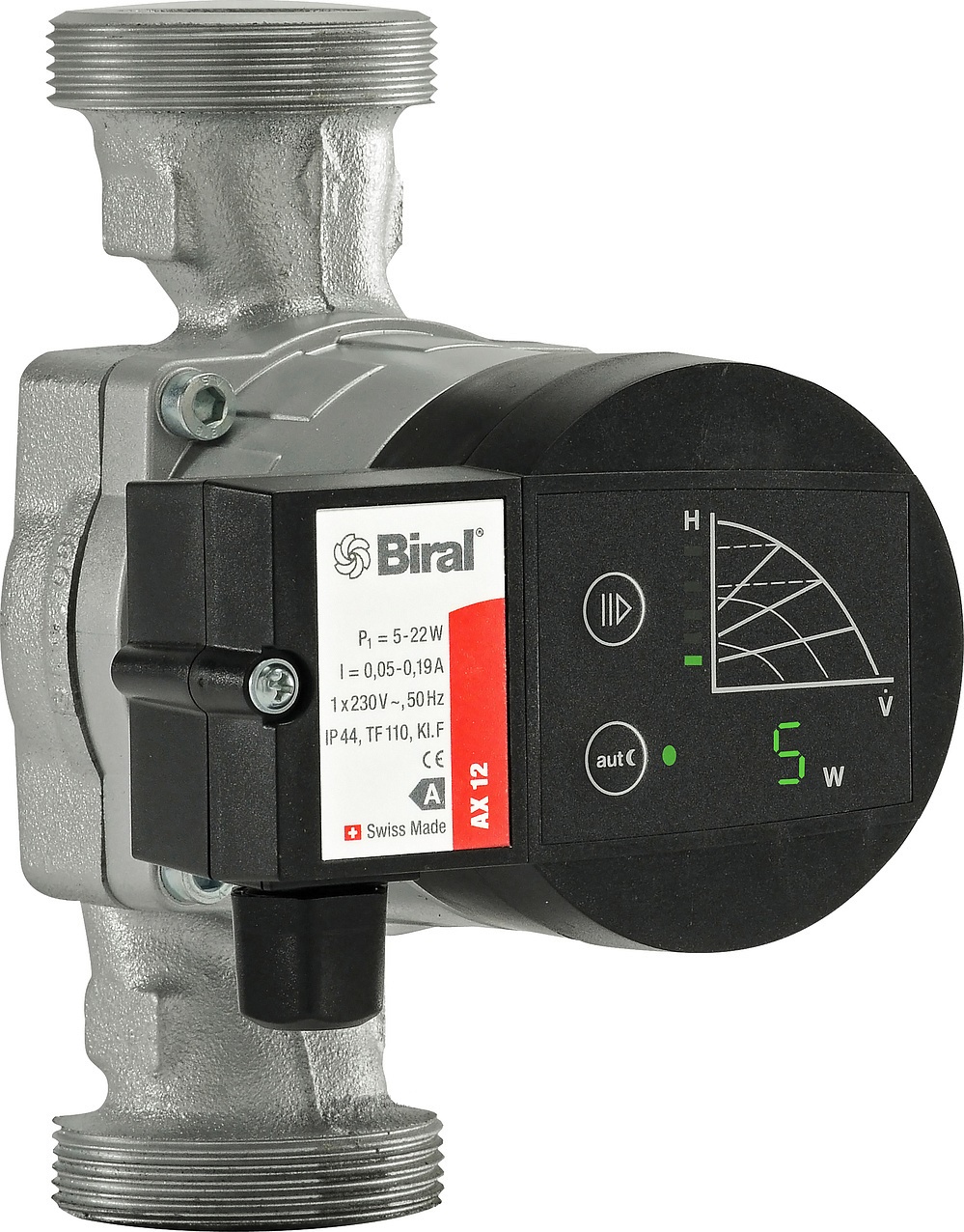 Циркуляционный насос Biral AX 12-3 высокоэффективный насос класса А, используемый для циркуляции воды в отопительной системе домов. Насос имеет: Электронный дисплей, с указанием текущего потребления энергии и параметров функционирования (давление/поток); Возможность установки двух режимов функционирования «ночь-день» при постоянном или переменном давление. Установка включения /отключение (обратный клапан и шаровой клапан). Корпус насоса из бронзы.