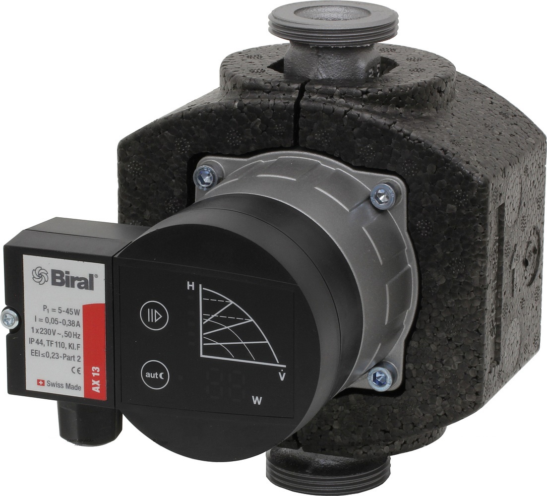 Циркуляционный насос Biral AX 13-3 высокоэффективный насос класса А, используемый для циркуляции воды в отопительной системе домов. Насос имеет: Электронный дисплей, с указанием текущего потребления энергии и параметров функционирования (давление/поток); Возможность установки двух режимов функционирования «ночь-день» при постоянном или переменном давление. Установка включения /отключение (обратный клапан и шаровой клапан). Корпус насоса из бронзы.