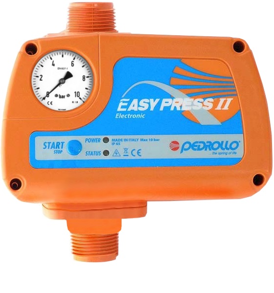 Изделия серии Pedrollo EASYPRESS 2 M (1.5 kw) являются электронными устройствами для запуска (при открытии крана) и остановки (при закрытии крана) однофазных электронасос. Микропроцессор регулятора давления защищает насос от работы всухую (при поступлении воды происходит автоматический запуск насоса), обеспечивая автоматическую или ручную перезагрузку. Кроме того защищает электронасос от слишком частых запусков из-за небольших утечек в системе.