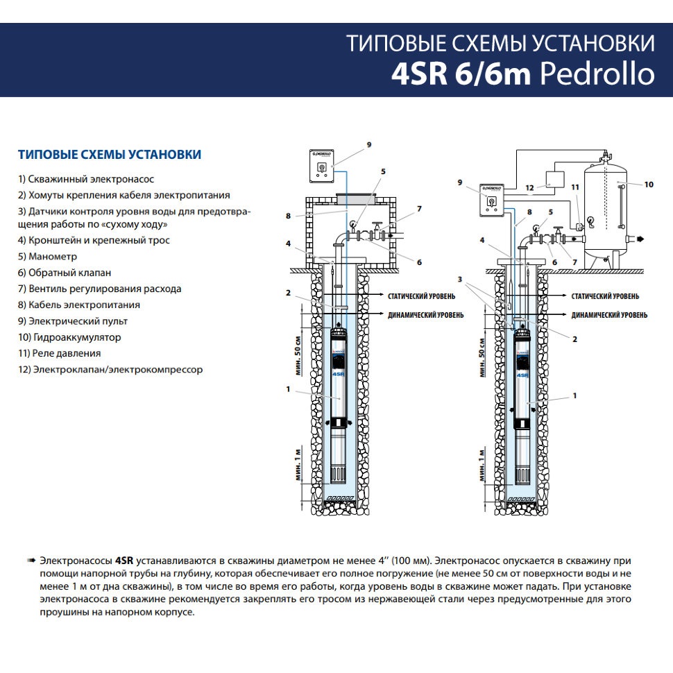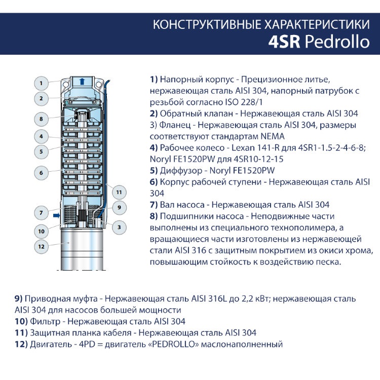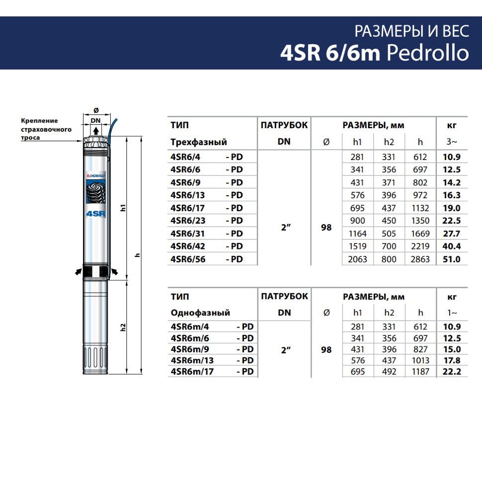 Погружные скваженые однофазные насосы Pedrollo 4SRm6/17-P рекомендуются для перекачки чистой воды, содержащей не более 150 г/м³ песка. Благодаря высокому кпд и их надежности, эти насосы применяются в быту, в коммунальном хозяйстве, в промышленности, для автоматической подачи воды совместно с автоматическими агрегатами поддержания давления, для орошения, для моечного оборудования, для увеличения напора и в системах противопожарной безопасности и т.д.