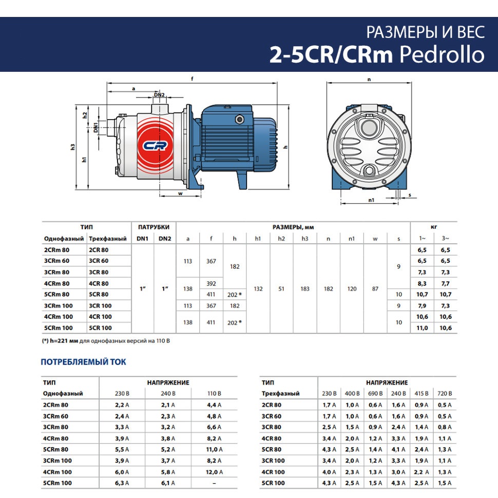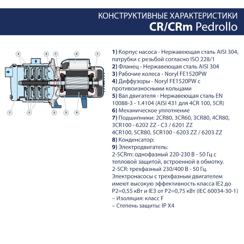 Центробежные многоступенчатые электронасосы Pedrollo 5CRm 100 1,1kW - рекомендуются для перекачивания чистой воды и жидкостей, химически неагрессивных по отношению к конструкционным материалам насоса. Благодаря своей надежности и бесшумности, эти насосы широко применяются в бытовом секторе, в частности, в сочетании с гидроаккумуляторами малых и средних объёмов, для подачи воды, для орошения огородов и садов и т.д. Установка насоса должна производиться в закрытых помещениях или в местах, защищенных от непогоды.