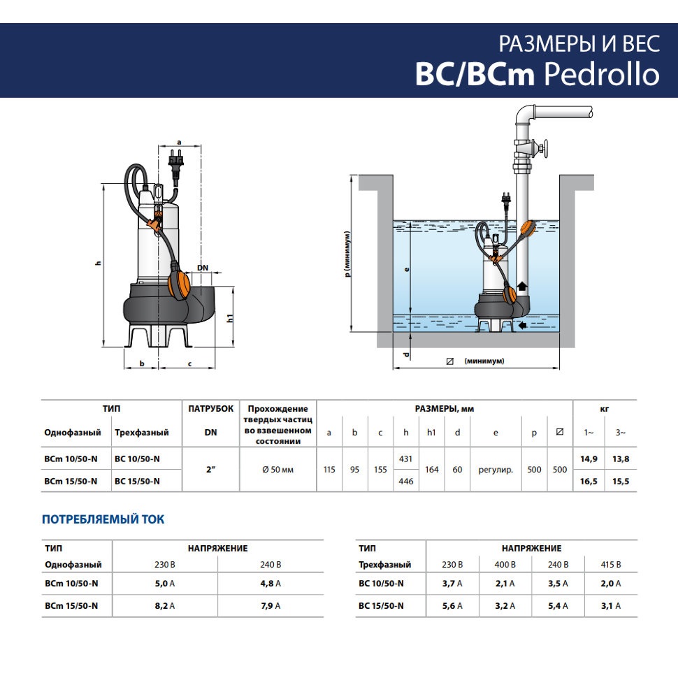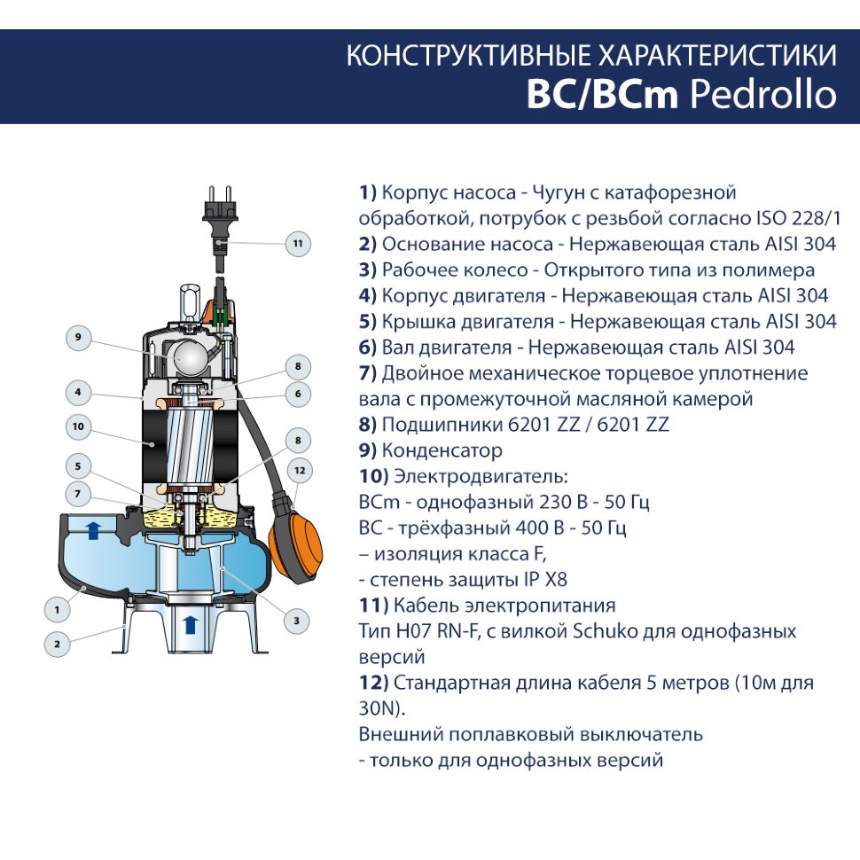 Погружной фекальный трехфазный электронасос Pedrollo BC15/50-N T - рекомендуются для дренажа загрязнённых сточных вод в бытовом секторе и коммунальном хозяйстве. Они оснащены ДВУХКАНАЛЬНЫМ рабочим колесом из нержавеющей стали, обеспечивающим перекачивание жидкости с присутствием во взвеси коротковолокнистых твердых частиц размерами до Ø 50 мм. Насосы предназначены для от вода сточных и канализационных вод, смеси воды с илом, по верхностных и грунтовых вод на таких объектах, как дачи, коттеджи, индивидуальные жилые дома. Эти насосы отличаются надежностью работы в автоматическом режиме при использовании в стационарном варианте.