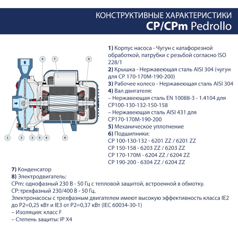 Центробежный однофазный электронасос Pedrollo CP 150 M - рекомендуются для перекачивания чистой, без абразивных частиц, воды и жидкостей, химически неагрессивных по отношению к конструкционным материалам насоса. Благодаря своей надёжности и простоте в эксплуатации, насосы находят широкое в коммунальном секторе, в сельском хозяйстве и в промышленности, а именно в системах водоснабжения, охлаждения, кондиционирования, орошения и т.д. Установка насоса должна производиться в закрытых помещениях или в местах, защищенных от непогоды.